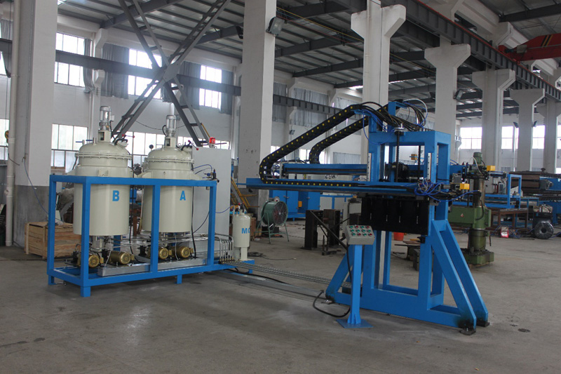 This polyurethane spray glue machine is used for continuous glue spraying on rockwool sandwich panel production lines with a servo linear motion control.